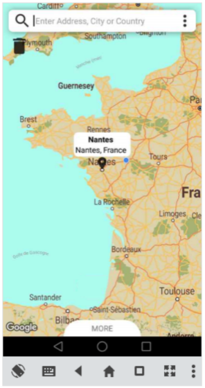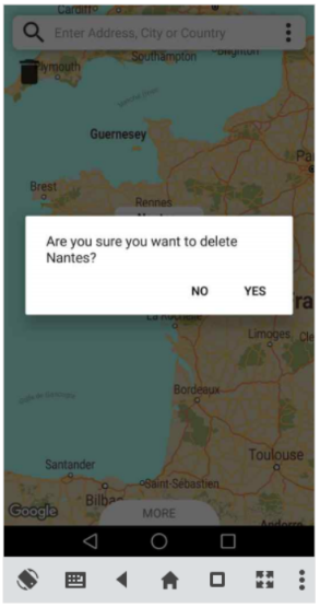 Pour réaliser un marquage sur la map, il suffit de rentrer l’adresse de la destination dans la barre de recherche puis de sélectionner une proposition. Un marqueur s’affichera ensuite sur la map. Lorsque vous cliquer sur le marqueur, une fenêtre d’information s’affiche au-dessus du marqueur et une deuxième d’informations supplémentaires est disponible en bas de l’écran. Une Icon « poubelle » permet de supprimer le marqueur et un pop-up s’affichera pour confirmer la suppression du marqueur sélectionner. Vous pouvez visualiser la fenêtre en bas de l’écran en la glissant vers le haut pour la déployer. Multiples informations son affiché dans la fenêtre déroulante. Il est possible de changer la date d’arrivée et de départ en cliquant dessus puis un pop-up s’affichera pour sélectionner la date voulue. Pour ajouter ou modifier la photo, il vous suffira également de cliquer dessus pour pouvoir la chercher dans votre répertoire de téléphone. La photo apparaitra dans la fenêtre à son emplacement prévu.