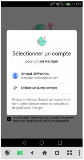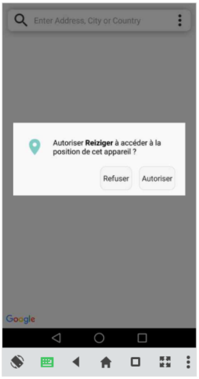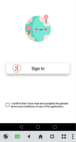 L’application démarre sur un SplashScreen pour présenter le logo de l’application et pour permettre à une deuxième version de faire le chargement de données. Une page de connexion s’affiche pour permettre à l’utilisateur d’enregistrer ces informations d’application dans une base de données et de pouvoir faire une demande de permission pour la géolocalisation du téléphone. Après le cochage de la checkbox et de l’appuie sur le bouton « Sign in », Un pop-up est dévoilé pour sélectionner son compte Gmail auquel l’application sera associée. Un deuxième pop-up sera affiché pour autoriser à l’application à accéder à la position de l’appareil.