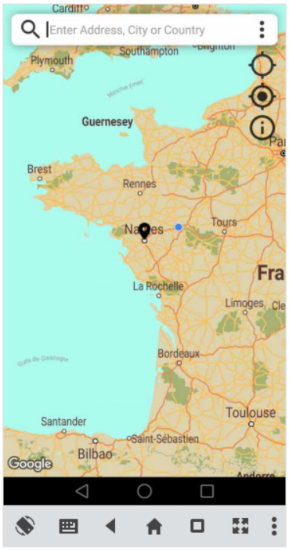 Voici la vue principale de l’application composé d’une barre de recherche en haut et d’un menu déroulant sur la droite avec en fond une map. Le menu déroulant est composé de trois icones.